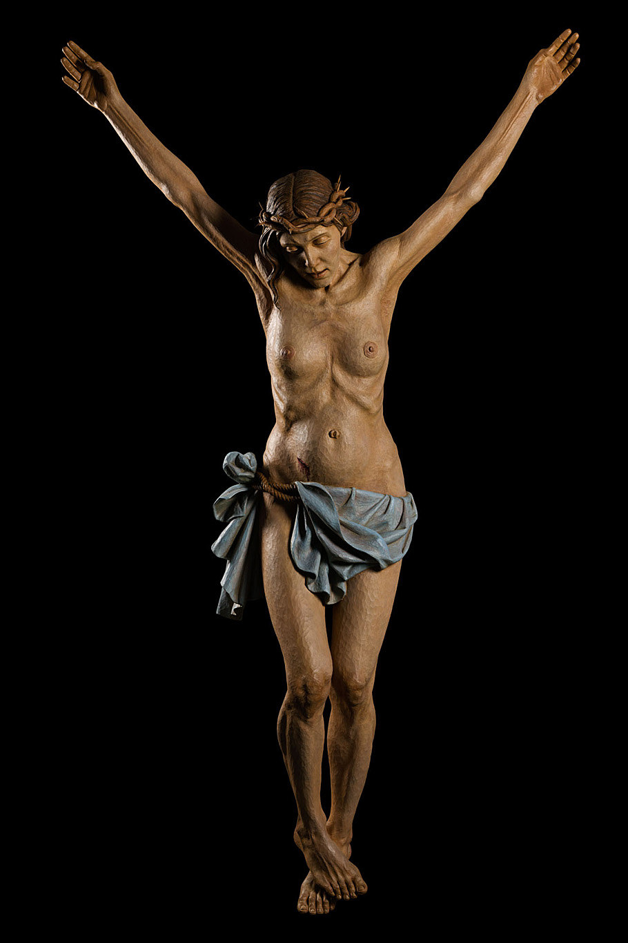 O simple feito de substituír ao protagonista masculino da crucifixión por unha muller transforma o significado relixioso orixinal desta icona universal, converténdoo en laico. Aínda así, a crucificada, na súa apreciación estética máis arrelixiosa, segue transpirando espiritualidade.