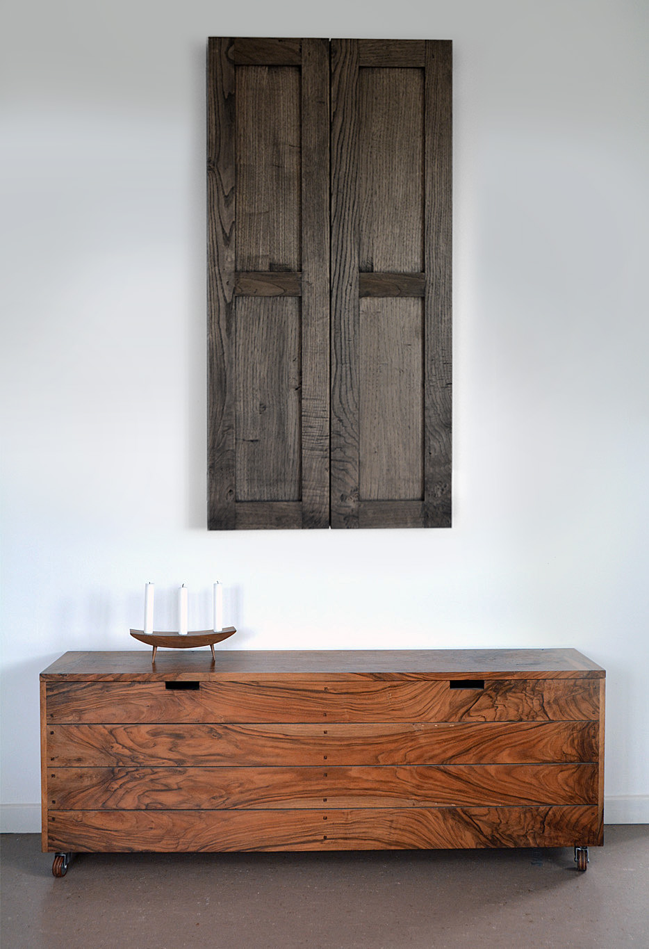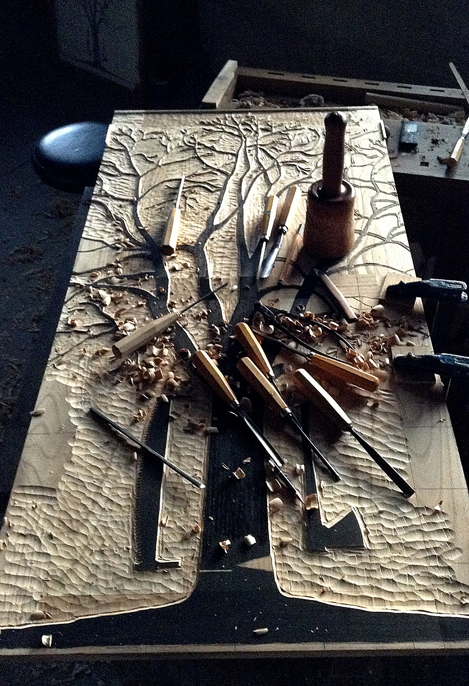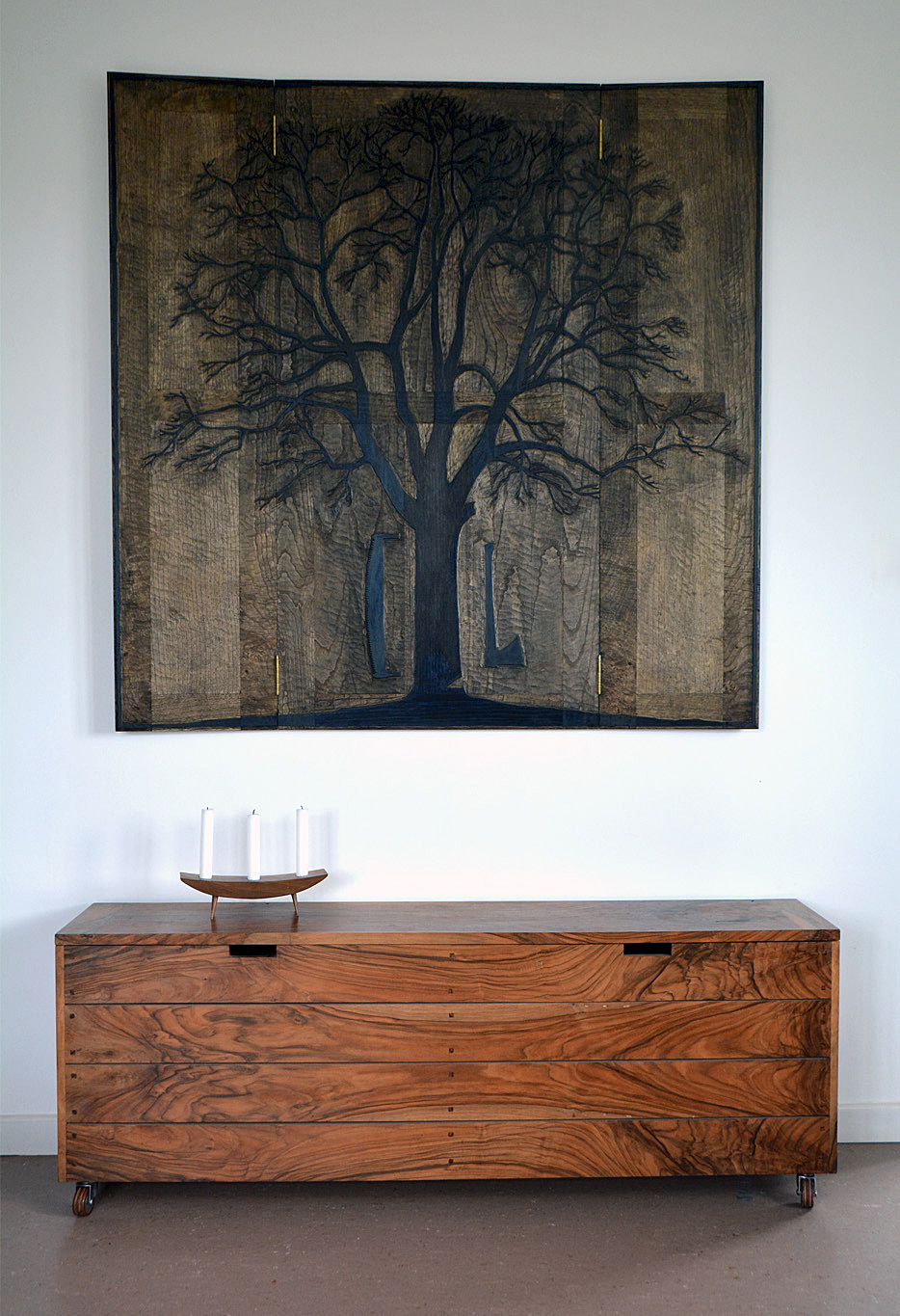 A imaxe móstranos unha árbore espida, no inverno, na época de curta, coas feridas do machado e a serra ao seu pé, representado o instante antes de caer abatido. A peza está concibida como unha matriz xilográfica, articulada en tres partes a modo de retablo para aludir ao seu carácter sacro.